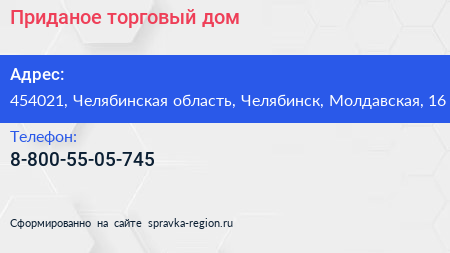 Приданое, торговый дом по адресу 454021, Челябинская область, Челябинск, Молдавская, 16 в дальнейшем Организация, размещена в следующих категориях: