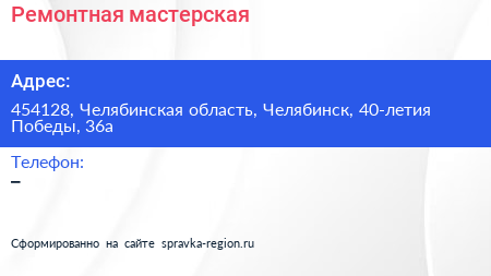 Ремонтная мастерская по адресу 454128, Челябинская область, Челябинск, 40-летия Победы, 36а в дальнейшем Организация, размещена в следующих категориях: