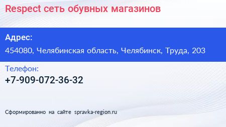 Respect, сеть обувных магазинов по адресу 454080, Челябинская область, Челябинск, Труда, 203 в дальнейшем Организация, размещена в следующих категориях: