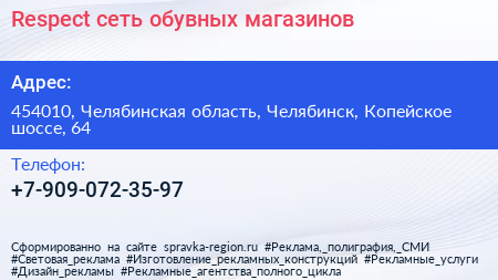 Respect, сеть обувных магазинов по адресу 454010, Челябинская область, Челябинск, Копейское шоссе, 64 в дальнейшем Организация, размещена в следующих категориях: