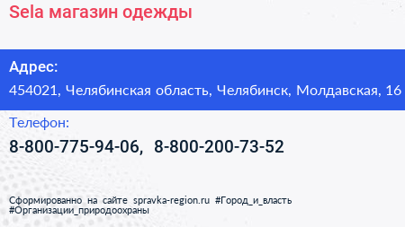 Sela, магазин одежды по адресу 454021, Челябинская область, Челябинск, Молдавская, 16 в дальнейшем Организация, размещена в следующих категориях: