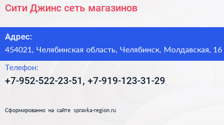 Сити Джинс, сеть магазинов по адресу 454021, Челябинская область, Челябинск, Молдавская, 16 в дальнейшем Организация, размещена в следующих категориях: