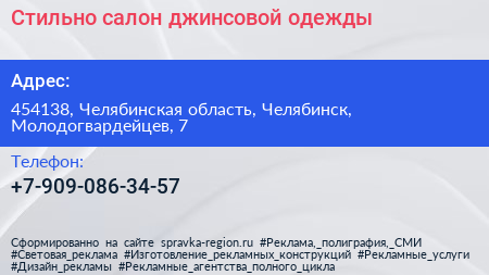 Стильно, салон джинсовой одежды по адресу 454138, Челябинская область, Челябинск, Молодогвардейцев, 7 в дальнейшем Организация, размещена в следующих категориях:
