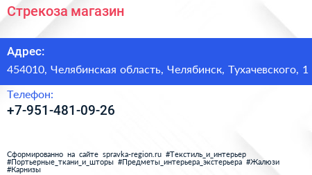 Стрекоза, магазин по адресу 454010, Челябинская область, Челябинск, Тухачевского, 1 в дальнейшем Организация, размещена в следующих категориях: