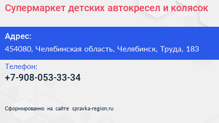 Супермаркет детских автокресел и колясок по адресу 454080, Челябинская область, Челябинск, Труда, 183 в дальнейшем Организация, размещена в следующих категориях: