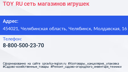 TOY.RU, сеть магазинов игрушек по адресу 454021, Челябинская область, Челябинск, Молдавская, 16 в дальнейшем Организация, размещена в следующих категориях: