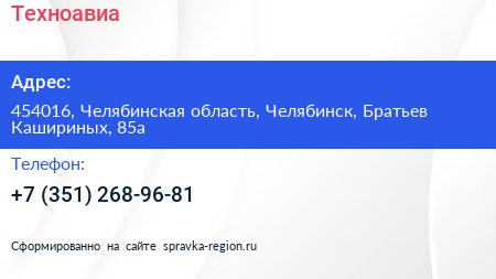 Техноавиа по адресу 454016, Челябинская область, Челябинск, Братьев Кашириных, 85а в дальнейшем Организация, размещена в следующих категориях: