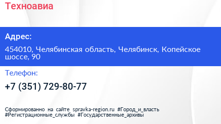 Техноавиа по адресу 454010, Челябинская область, Челябинск, Копейское шоссе, 90 в дальнейшем Организация, размещена в следующих категориях: