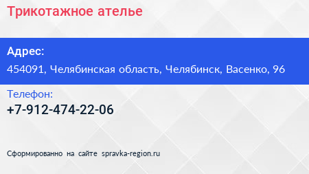 Трикотажное ателье по адресу 454091, Челябинская область, Челябинск, Васенко, 96 в дальнейшем Организация, размещена в следующих категориях: