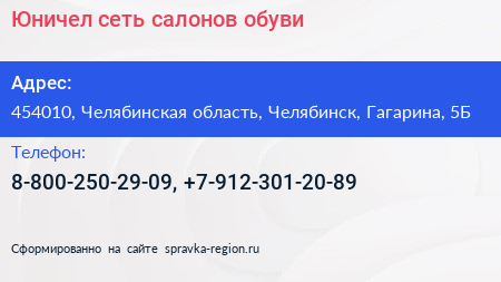 Юничел, сеть салонов обуви по адресу 454010, Челябинская область, Челябинск, Гагарина, 5Б в дальнейшем Организация, размещена в следующих категориях: