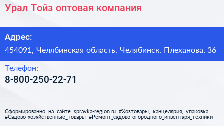 Урал Тойз, оптовая компания по адресу 454091, Челябинская область, Челябинск, Плеханова, 36 в дальнейшем Организация, размещена в следующих категориях: