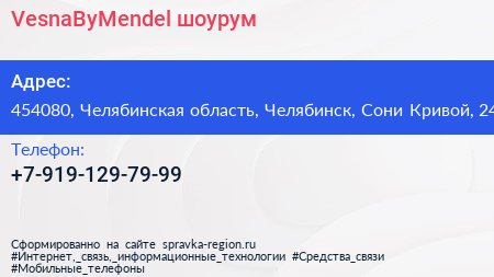 VesnaByMendel, шоурум по адресу 454080, Челябинская область, Челябинск, Сони Кривой, 24 в дальнейшем Организация, размещена в следующих категориях: