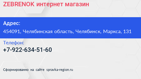 ZEBRENOK, интернет-магазин по адресу 454091, Челябинская область, Челябинск, Маркса, 131 в дальнейшем Организация, размещена в следующих категориях: