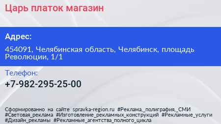 Царь-платок, магазин по адресу 454091, Челябинская область, Челябинск, площадь Революции, 1/1 в дальнейшем Организация, размещена в следующих категориях: