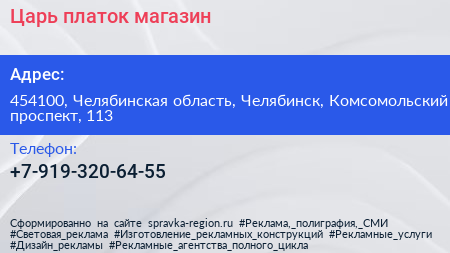 Царь-платок, магазин по адресу 454100, Челябинская область, Челябинск, Комсомольский проспект, 113 в дальнейшем Организация, размещена в следующих категориях: