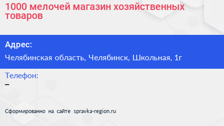 1000 мелочей, магазин хозяйственных товаров по адресу Челябинская область, Челябинск, Школьная, 1г в дальнейшем Организация, размещена в следующих категориях: