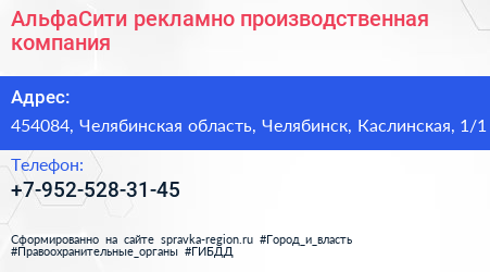 АльфаСити, рекламно-производственная компания по адресу 454084, Челябинская область, Челябинск, Каслинская, 1/1 в дальнейшем Организация, размещена в следующих категориях: