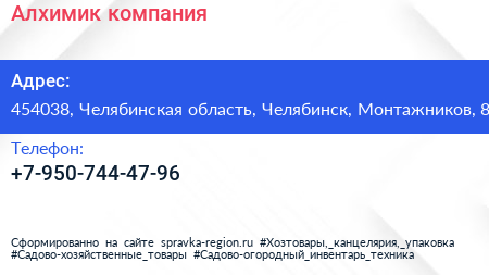 Алхимик, компания по адресу 454038, Челябинская область, Челябинск, Монтажников, 8 в дальнейшем Организация, размещена в следующих категориях:
