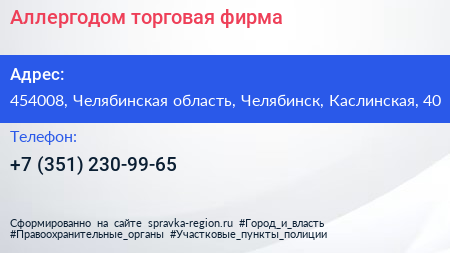 Аллергодом, торговая фирма по адресу 454008, Челябинская область, Челябинск, Каслинская, 40 в дальнейшем Организация, размещена в следующих категориях: