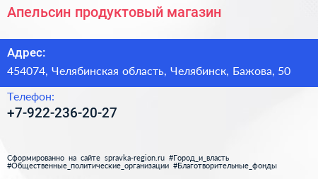Апельсин, продуктовый магазин по адресу 454074, Челябинская область, Челябинск, Бажова, 50 в дальнейшем Организация, размещена в следующих категориях: