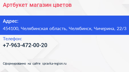 Артбукет, магазин цветов по адресу 454100, Челябинская область, Челябинск, Чичерина, 22/3 в дальнейшем Организация, размещена в следующих категориях: