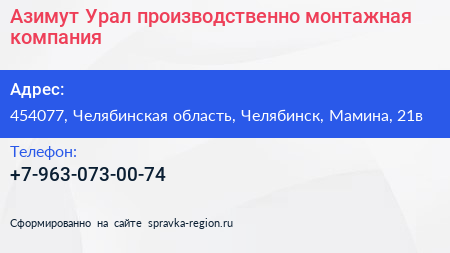 Азимут Урал, производственно-монтажная компания по адресу 454077, Челябинская область, Челябинск, Мамина, 21в в дальнейшем Организация, размещена в следующих категориях: