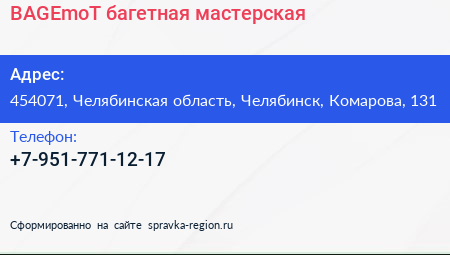 BAGEmoT, багетная мастерская по адресу 454071, Челябинская область, Челябинск, Комарова, 131 в дальнейшем Организация, размещена в следующих категориях: