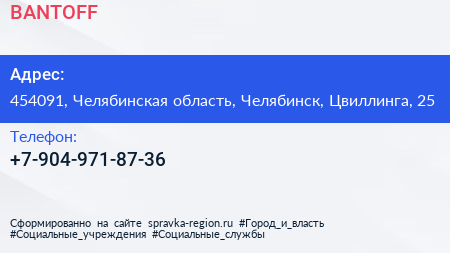 BANTOFF по адресу 454091, Челябинская область, Челябинск, Цвиллинга, 25 в дальнейшем Организация, размещена в следующих категориях: