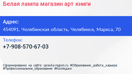 Белая лампа, магазин арт-книги по адресу 454091, Челябинская область, Челябинск, Маркса, 70 в дальнейшем Организация, размещена в следующих категориях: