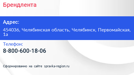 Брендлента по адресу 454036, Челябинская область, Челябинск, Первомайская, 1а в дальнейшем Организация, размещена в следующих категориях: