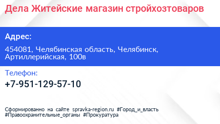 Дела Житейские, магазин стройхозтоваров по адресу 454081, Челябинская область, Челябинск, Артиллерийская, 100в в дальнейшем Организация, размещена в следующих категориях: