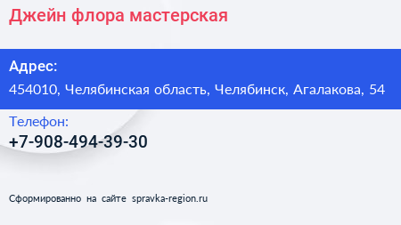 Джейн флора, мастерская по адресу 454010, Челябинская область, Челябинск, Агалакова, 54 в дальнейшем Организация, размещена в следующих категориях: