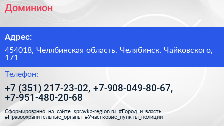 Доминион по адресу 454018, Челябинская область, Челябинск, Чайковского, 171 в дальнейшем Организация, размещена в следующих категориях: