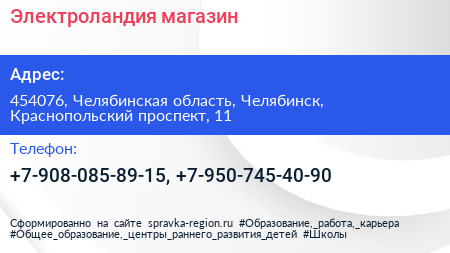 Электроландия, магазин по адресу 454076, Челябинская область, Челябинск, Краснопольский проспект, 11 в дальнейшем Организация, размещена в следующих категориях: