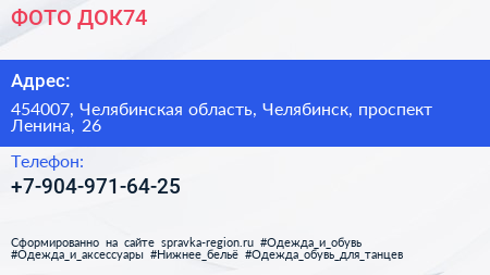 ФОТО.ДОК74 по адресу 454007, Челябинская область, Челябинск, проспект Ленина, 26 в дальнейшем Организация, размещена в следующих категориях: