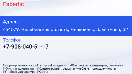 Faberlic по адресу 454079, Челябинская область, Челябинск, Зальцмана, 32 в дальнейшем Организация, размещена в следующих категориях: