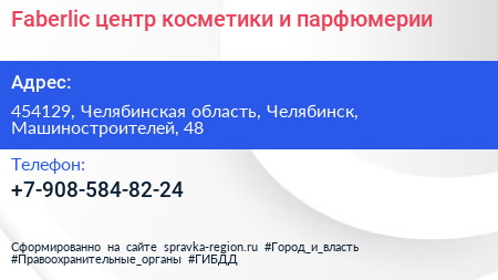 Faberlic, центр косметики и парфюмерии по адресу 454129, Челябинская область, Челябинск, Машиностроителей, 48 в дальнейшем Организация, размещена в следующих категориях: