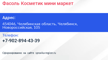 Фасоль-Косметик, мини-маркет по адресу 454046, Челябинская область, Челябинск, Новороссийская, 105 в дальнейшем Организация, размещена в следующих категориях: