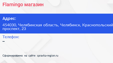 Flamingo, магазин по адресу 454030, Челябинская область, Челябинск, Краснопольский проспект, 23 в дальнейшем Организация, размещена в следующих категориях: