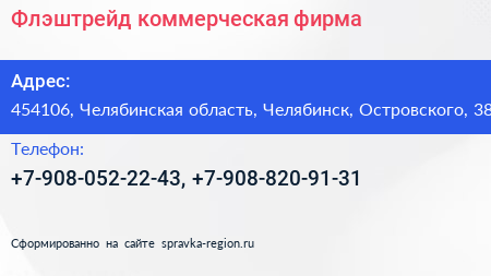 Флэштрейд, коммерческая фирма по адресу 454106, Челябинская область, Челябинск, Островского, 38 в дальнейшем Организация, размещена в следующих категориях:
