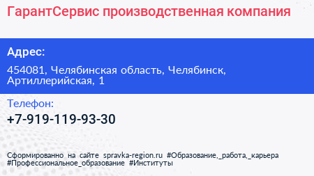ГарантСервис, производственная компания по адресу 454081, Челябинская область, Челябинск, Артиллерийская, 1 в дальнейшем Организация, размещена в следующих категориях: