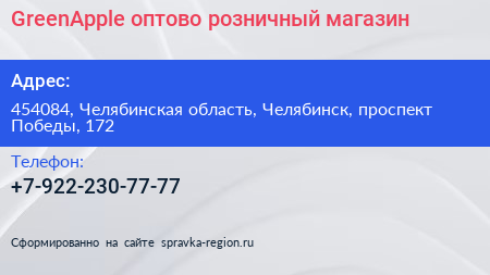 GreenApple, оптово-розничный магазин по адресу 454084, Челябинская область, Челябинск, проспект Победы, 172 в дальнейшем Организация, размещена в следующих категориях: