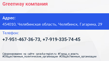 Greenway, компания по адресу 454010, Челябинская область, Челябинск, Гагарина, 29 в дальнейшем Организация, размещена в следующих категориях: