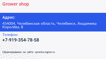 Grower-shop по адресу 454004, Челябинская область, Челябинск, Академика Королёва, 8 в дальнейшем Организация, размещена в следующих категориях:
