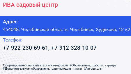 ИВА, садовый центр по адресу 454048, Челябинская область, Челябинск, Худякова, 12 к2 в дальнейшем Организация, размещена в следующих категориях: