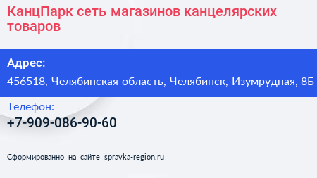 КанцПарк, сеть магазинов канцелярских товаров по адресу 456518, Челябинская область, Челябинск, Изумрудная, 8Б в дальнейшем Организация, размещена в следующих категориях:
