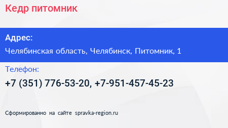 Кедр, питомник по адресу Челябинская область, Челябинск, Питомник, 1 в дальнейшем Организация, размещена в следующих категориях: