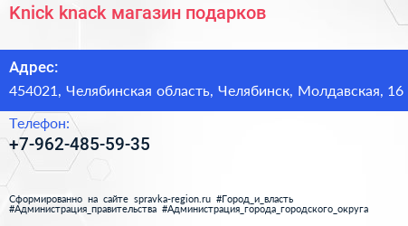 Knick-knack, магазин подарков по адресу 454021, Челябинская область, Челябинск, Молдавская, 16 в дальнейшем Организация, размещена в следующих категориях: