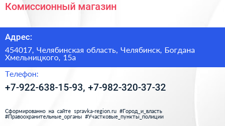 Комиссионный магазин по адресу 454017, Челябинская область, Челябинск, Богдана Хмельницкого, 15а в дальнейшем Организация, размещена в следующих категориях: