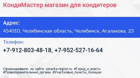 КондиМастер, магазин для кондитеров по адресу 454010, Челябинская область, Челябинск, Агалакова, 23 в дальнейшем Организация, размещена в следующих категориях: